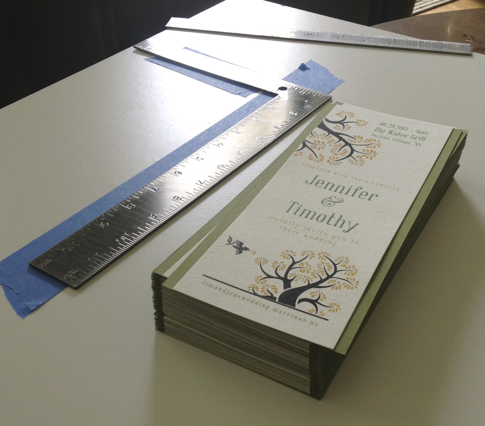 Sunday we managed to get the bulk of wedding invites put together. Much to Jen’s surprise, my engineering skills came into use and surprised even her. With three pieces of blue masking tape stacked together and a metal square double taped down offset from the tape edge, I was able to create a jig to make all of the invites centered on the green background. All we had to do was slide the green sheet under the ruler and against the blue tape; the already double-sided-taped top sheet was then aligned with the ruler and pressed down in the center. With Jen’s very symmetrical eye she was excited with the results after the first eight were off a millimeter here and there making her insane. As all can imagine, it is a much better arrangement when the bride-to-be is happy.