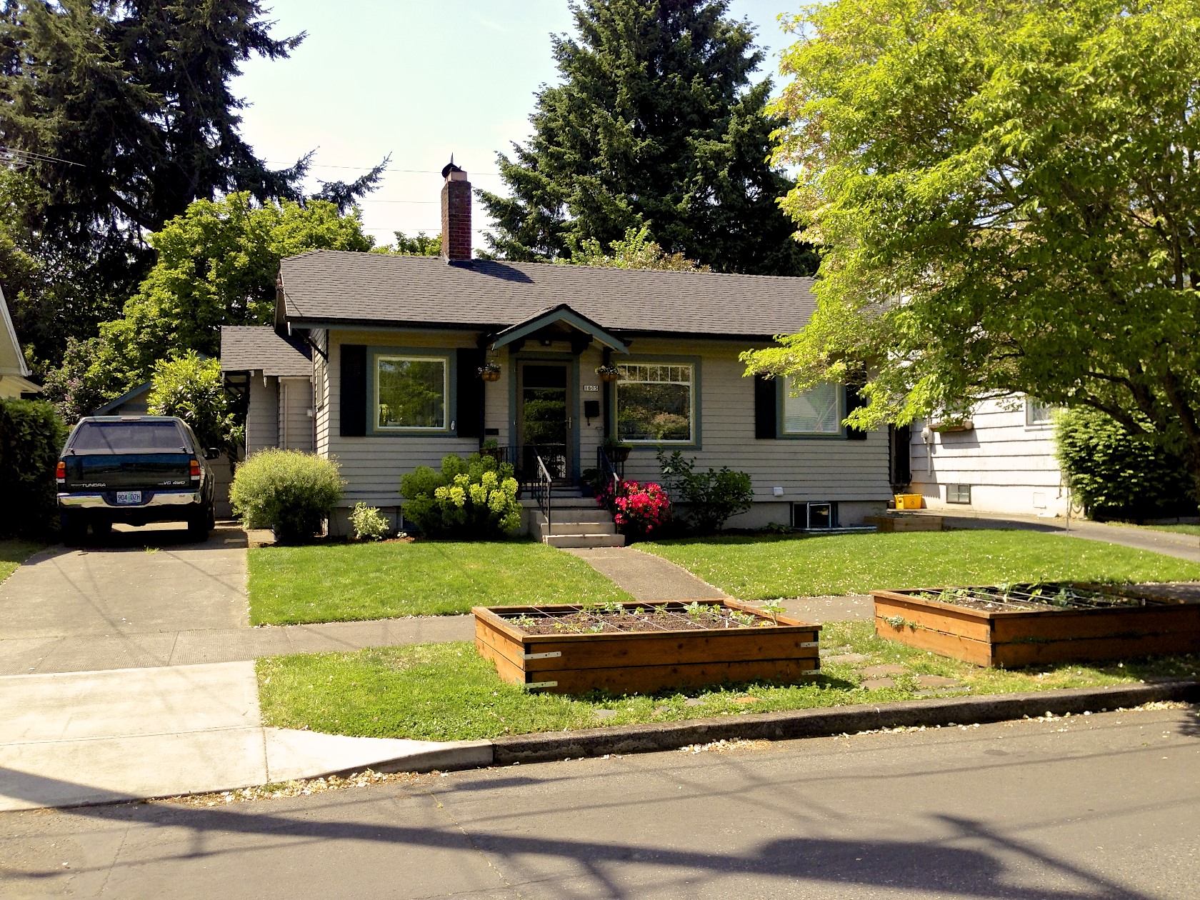 On the homefront we have been getting some nice compliments from passersby. I think it is mostly due to the bright pinkish-red flowers next to the porch being in full bloom, but, in the big picture, the garden is coming in, the grass is now full and green (with the help of a bit of fertilizer), and I put a nice edge on the lawn after mowing it. It definitely looks a bit tidier this way. If you look closely at the far right side of the house you will notice another one of our mini-projects, a 3′ X 3′ raised bed from 2 weeks ago.