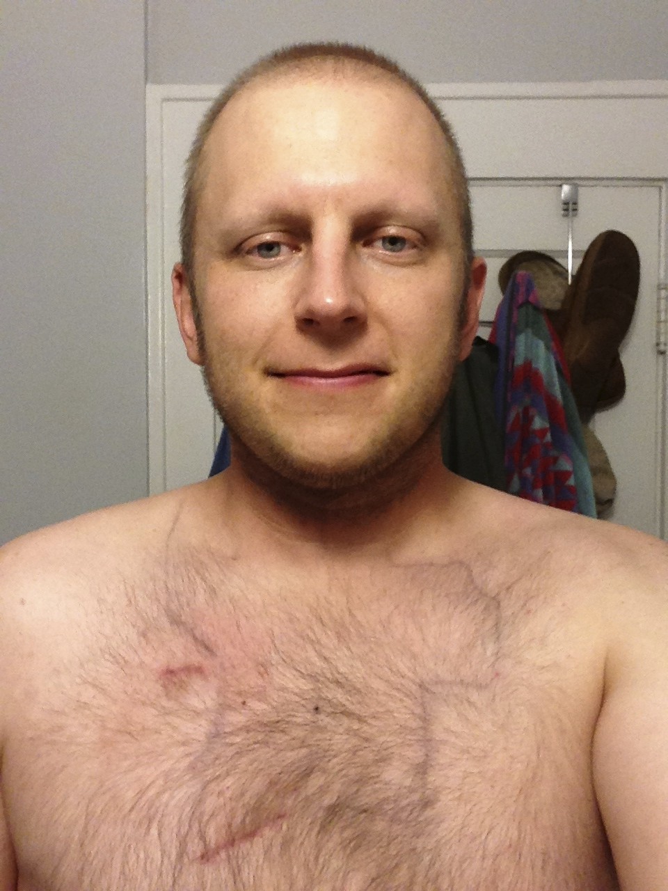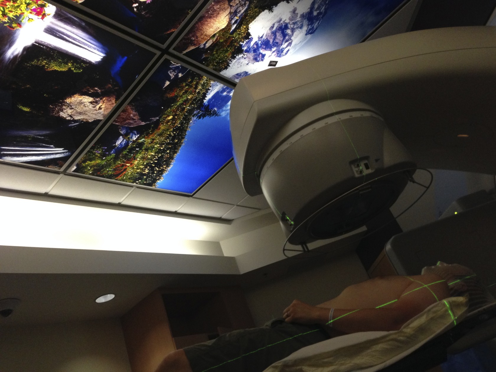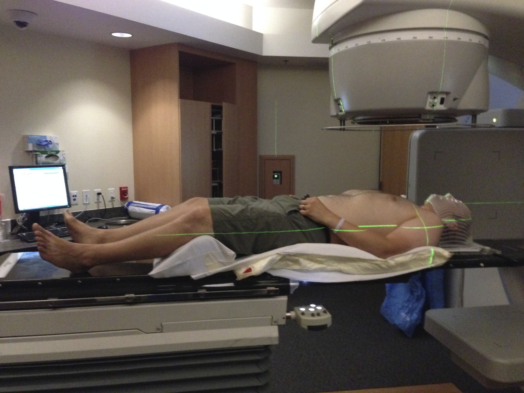 Below is one more picture of an ugly half-naked guy. I took a picture a little late in the day so the lines had almost worn off, but they show the radiation zone. It starts below the voice box and fans out to either side with the middle narrower region extending just above my scar. Also, in the very center is one of my four tattoos. At this link there are some pictures, and the right one is very similar to the machine I use…except my shirt is off so they can line me up and they clamp my face down with a fancy mask. I had one of the awesome nurses take some pictures of me ready for treatment, and I took a panoramic of the room, all of which are below. FYI…clicking on them will make them bigger.